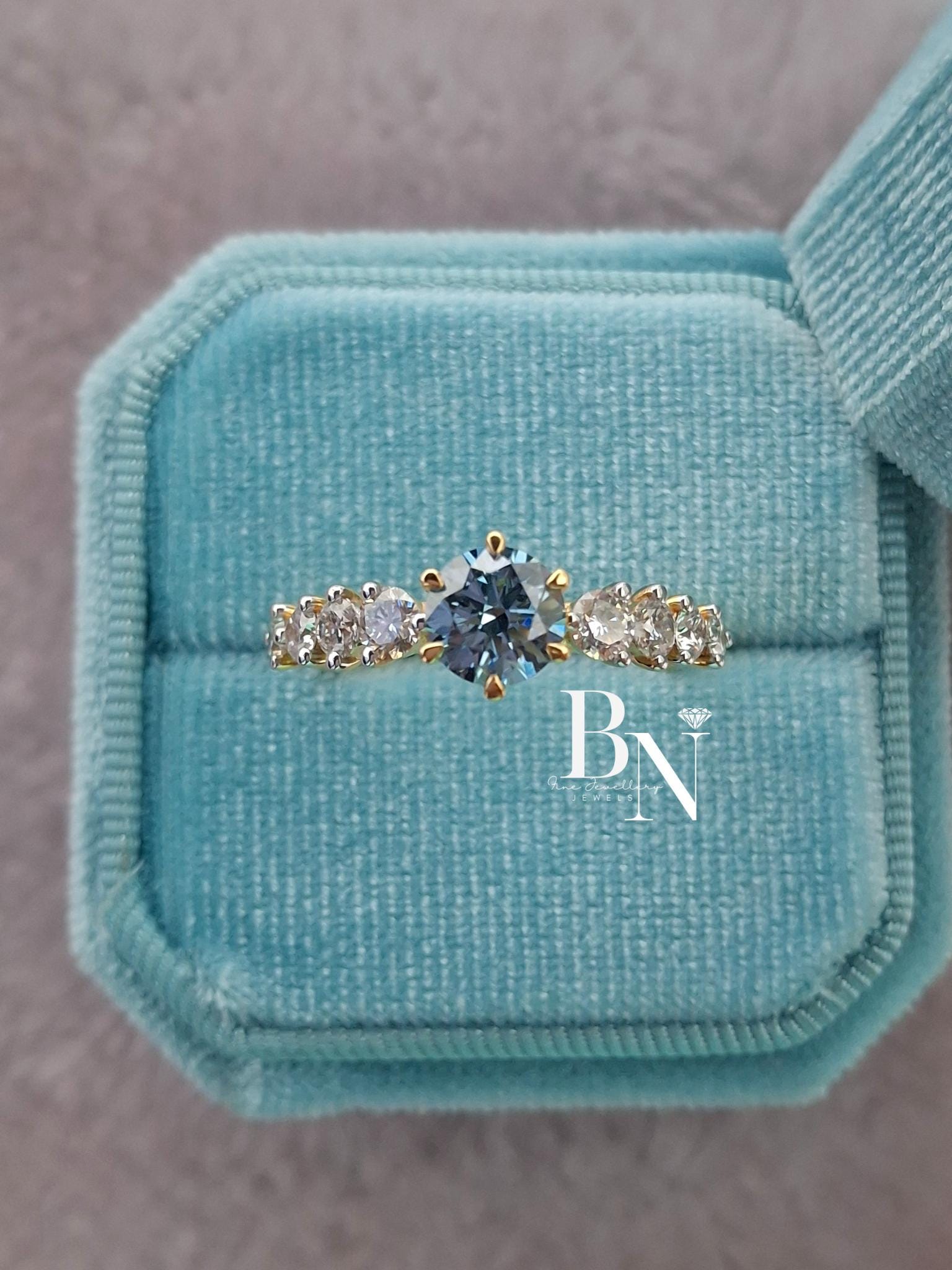 1.00 CT Blue Diamond Engagement Ring 1ct | Graduated Diamond Band 14k Gold | Something Blue Wedding Ring | Unique Statement Ring
